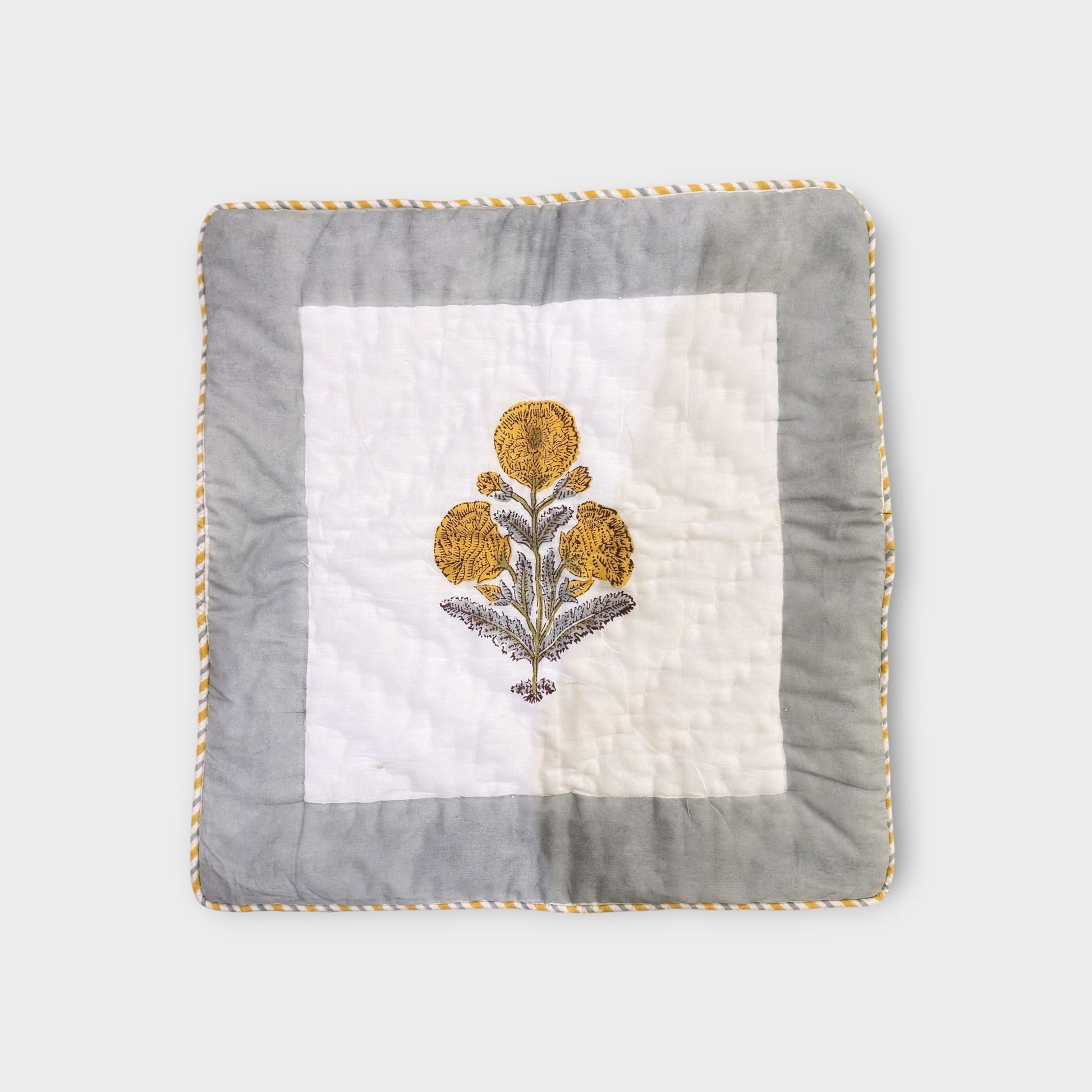 Add a touch of charm to your living space with our beautifully quilted cotton cushion cover. Designed for both style and comfort, this piece features a motif print on the front and a small all-over pattern on the back. The front is hand-quilted, and the cover opens from the top for easy use.