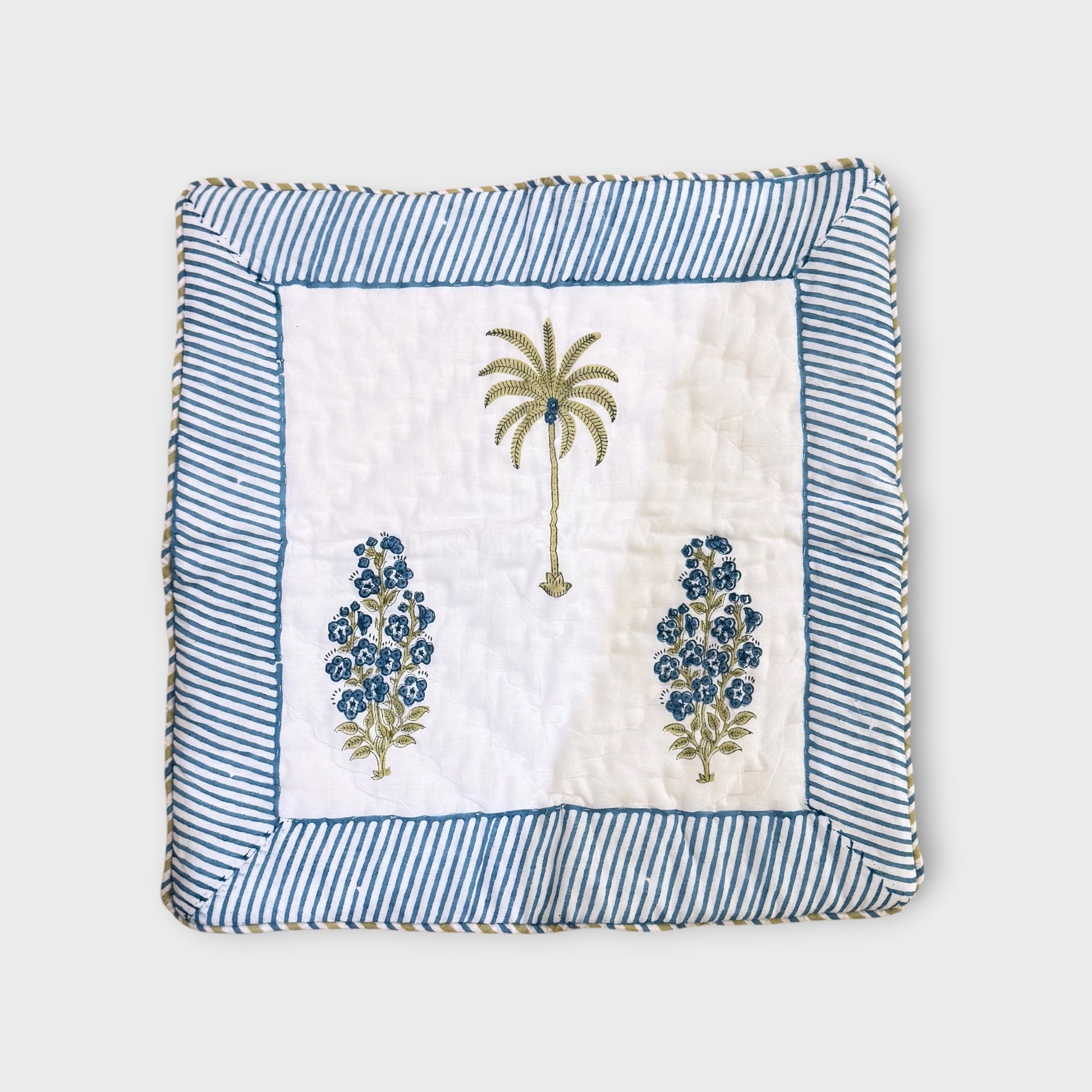 Add a touch of charm to your living space with our beautifully quilted cotton cushion cover. Designed for both style and comfort, this piece features a motif print on the front and a small all-over pattern on the back. The front is hand-quilted, and the cover opens from the top for easy use.