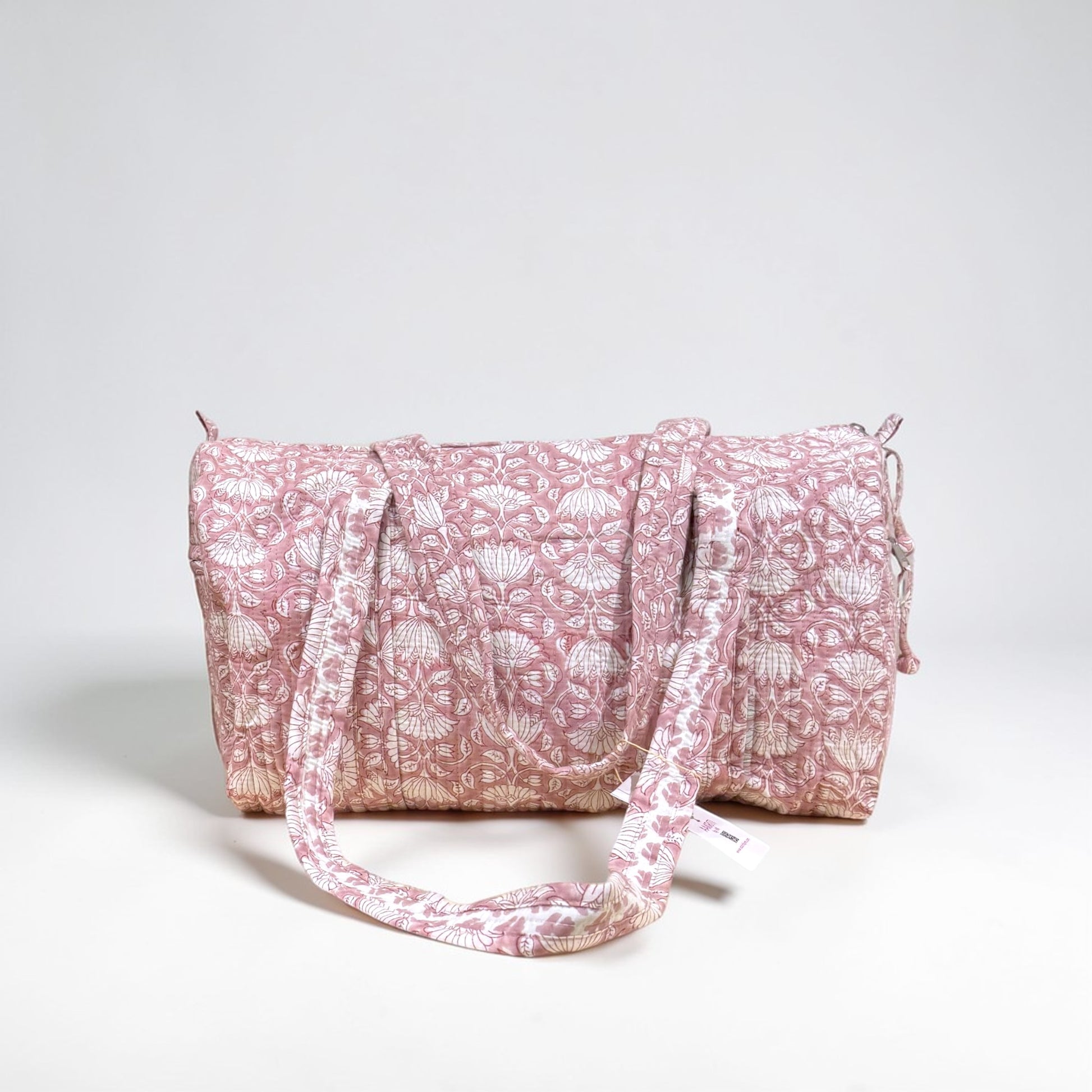 Travel in style with our handcrafted quilted duffle bag, made from 100% cotton and adorned with traditional block prints. Lightweight yet durable, it's designed to carry all your essentials with ease and elegance.