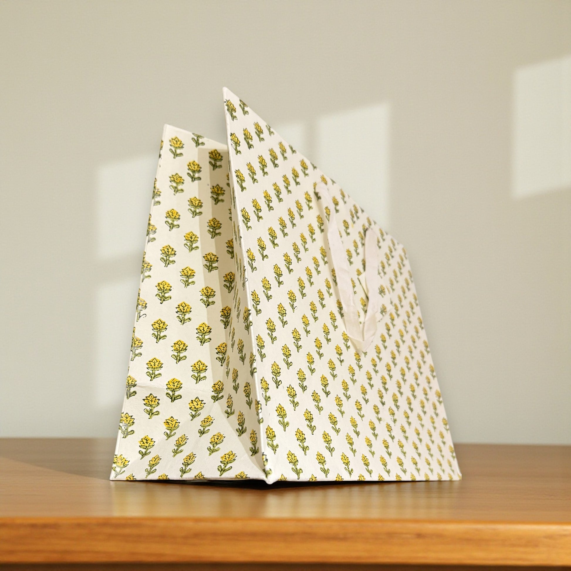 Discover the beauty of craftsmanship with our handmade paper bag, created using good quality handmade paper and adorned with traditional hand block printing. Available in 3 sizes, these bags are designed to add charm and elegance to any gift or purchase.