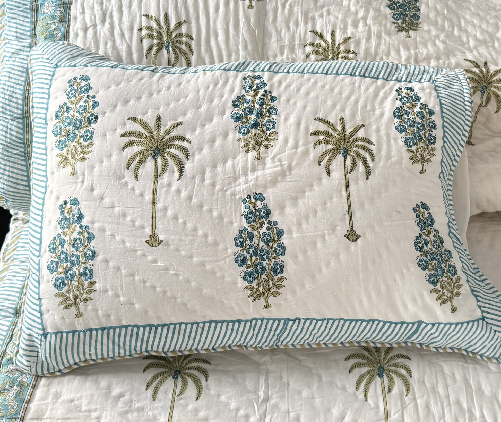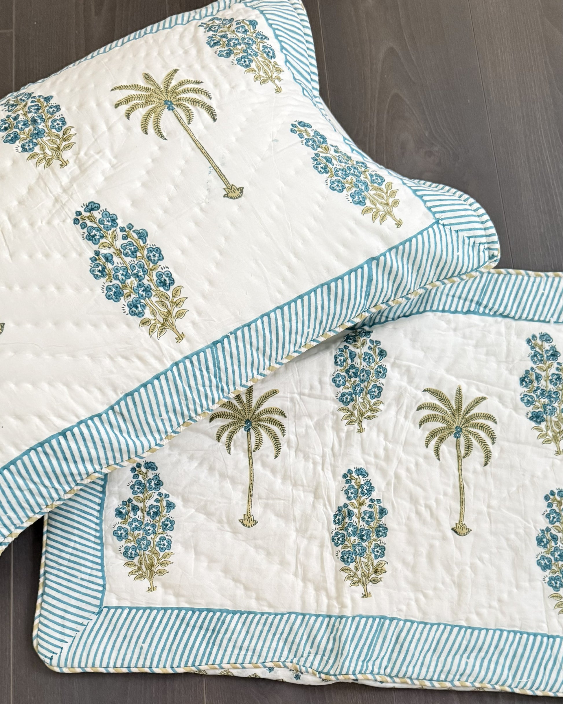 Add a touch of comfort and craftsmanship to your bedroom with this beautiful set of 2 hand-quilted pillow cases. The top layer is softly quilted with cotton filling, giving a luxurious, plush feel, while the back features an elegant all-over small motif print.
