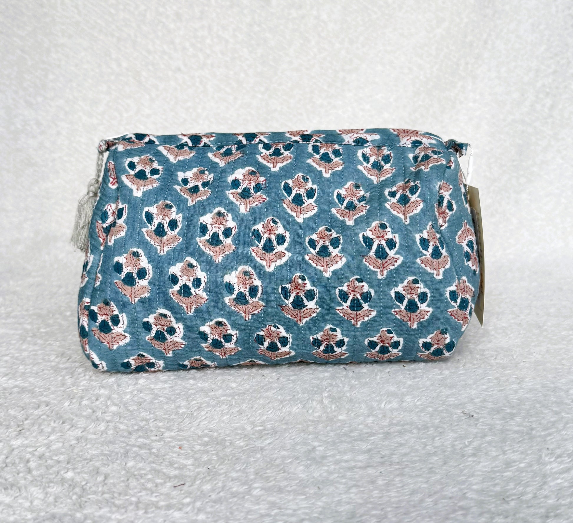 This charming pouch is made from 100% cotton and features a unique hand-block print with intricate quilting for added texture and durability. Inside, you’ll find a waterproof and leakproof lining for added protection, perfect for carrying essentials with style and functionality.