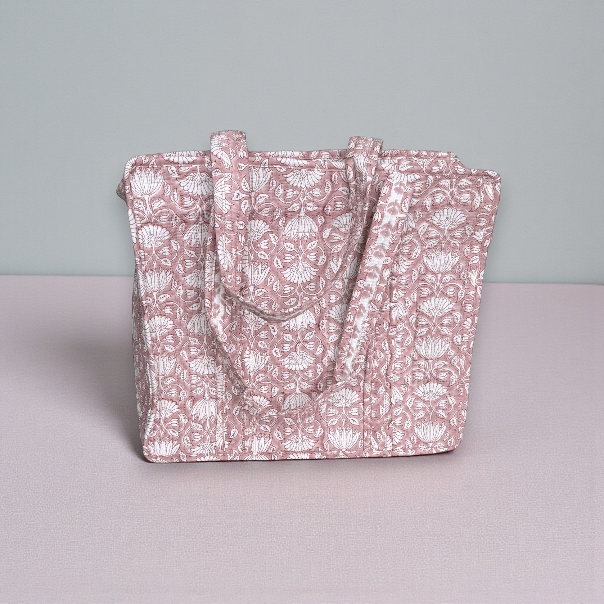 Made in 100% cotton, this spacious tote bag features authentic hand-block printing and a quilted, padded design for durability and comfort. The top closure is secured with a premium YKK zipper, keeping your belongings safe and organized.