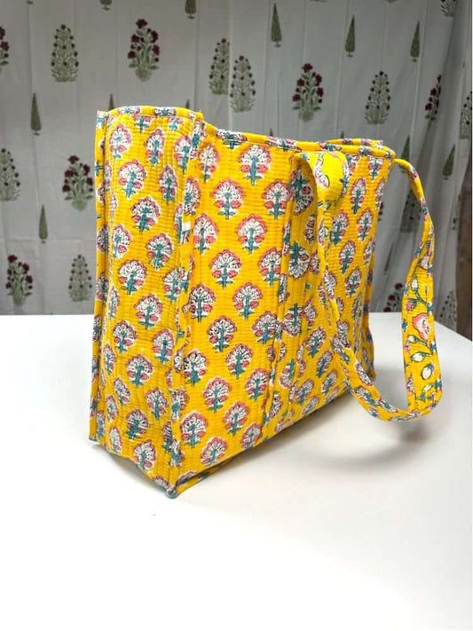 Made in 100% cotton, this spacious tote bag features authentic hand-block printing and a quilted, padded design for durability and comfort. The top closure is secured with a premium YKK zipper, keeping your belongings safe and organized.