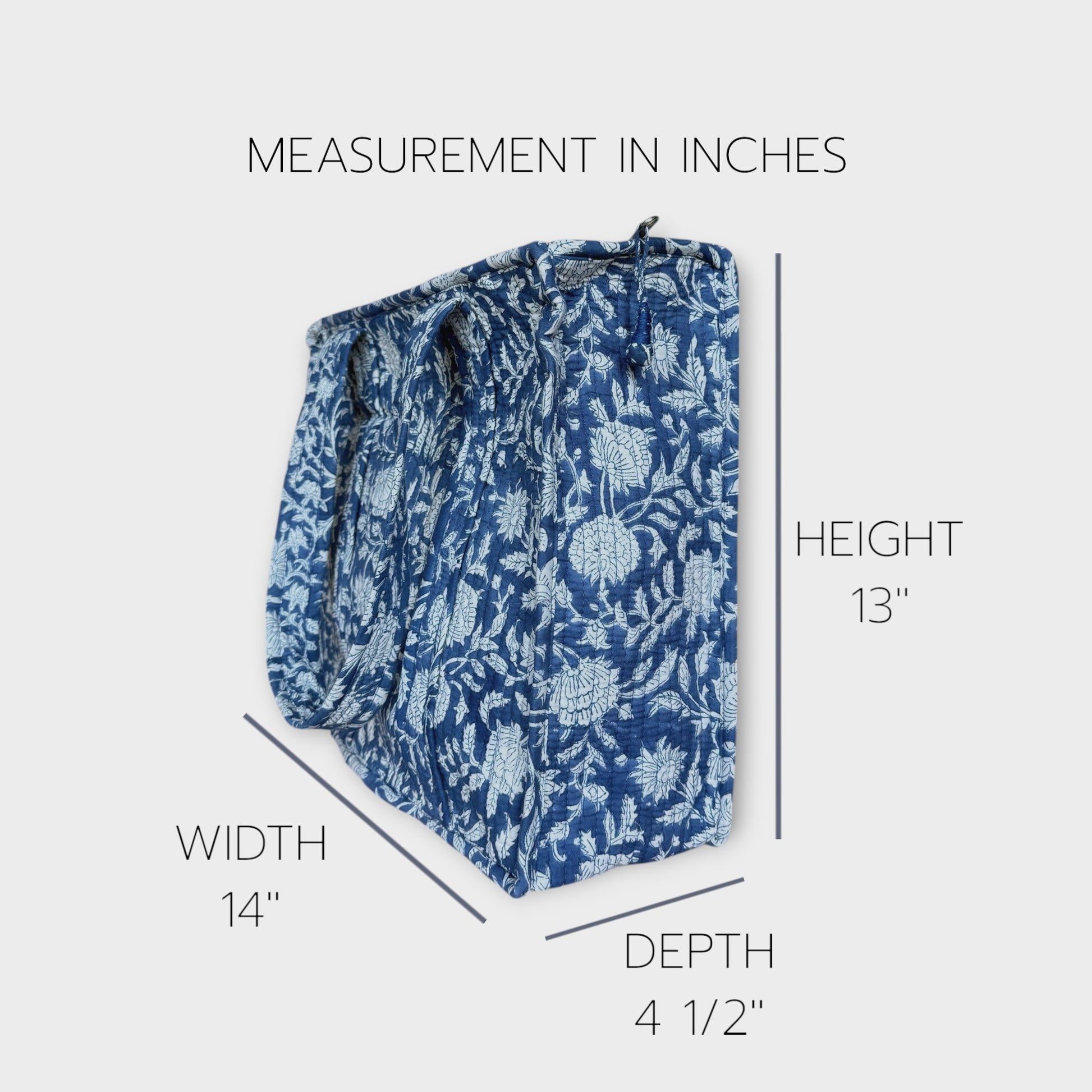 Made in 100% cotton, this spacious tote bag features authentic hand-block printing and a quilted, padded design for durability and comfort. The top closure is secured with a premium YKK zipper, keeping your belongings safe and organized.