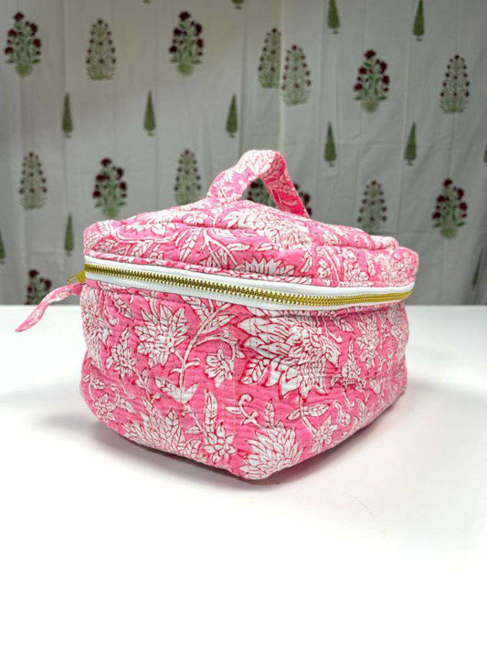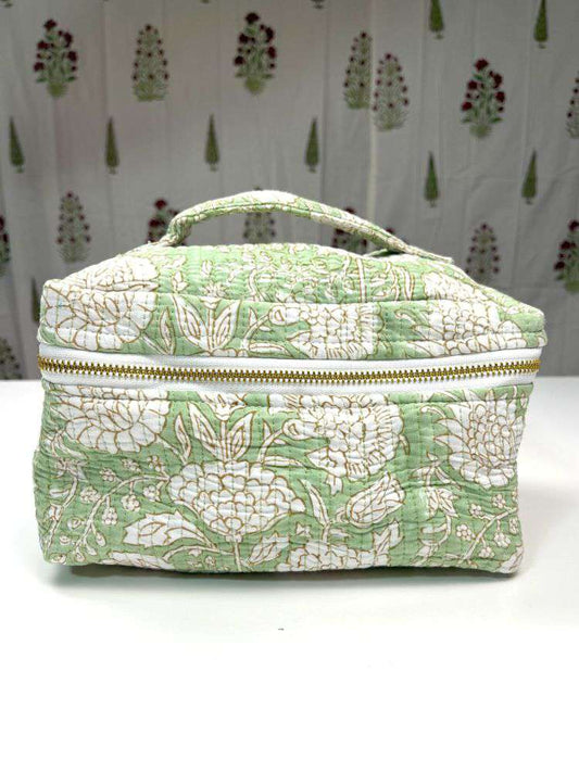This elegant vanity bag is Made in 100% cotton with authentic block print, enhanced by quilted detailing for added structure and style. The bag opens like a suitcase with a 3-side antique gold YKK metal zipper, providing easy access to all your essentials.