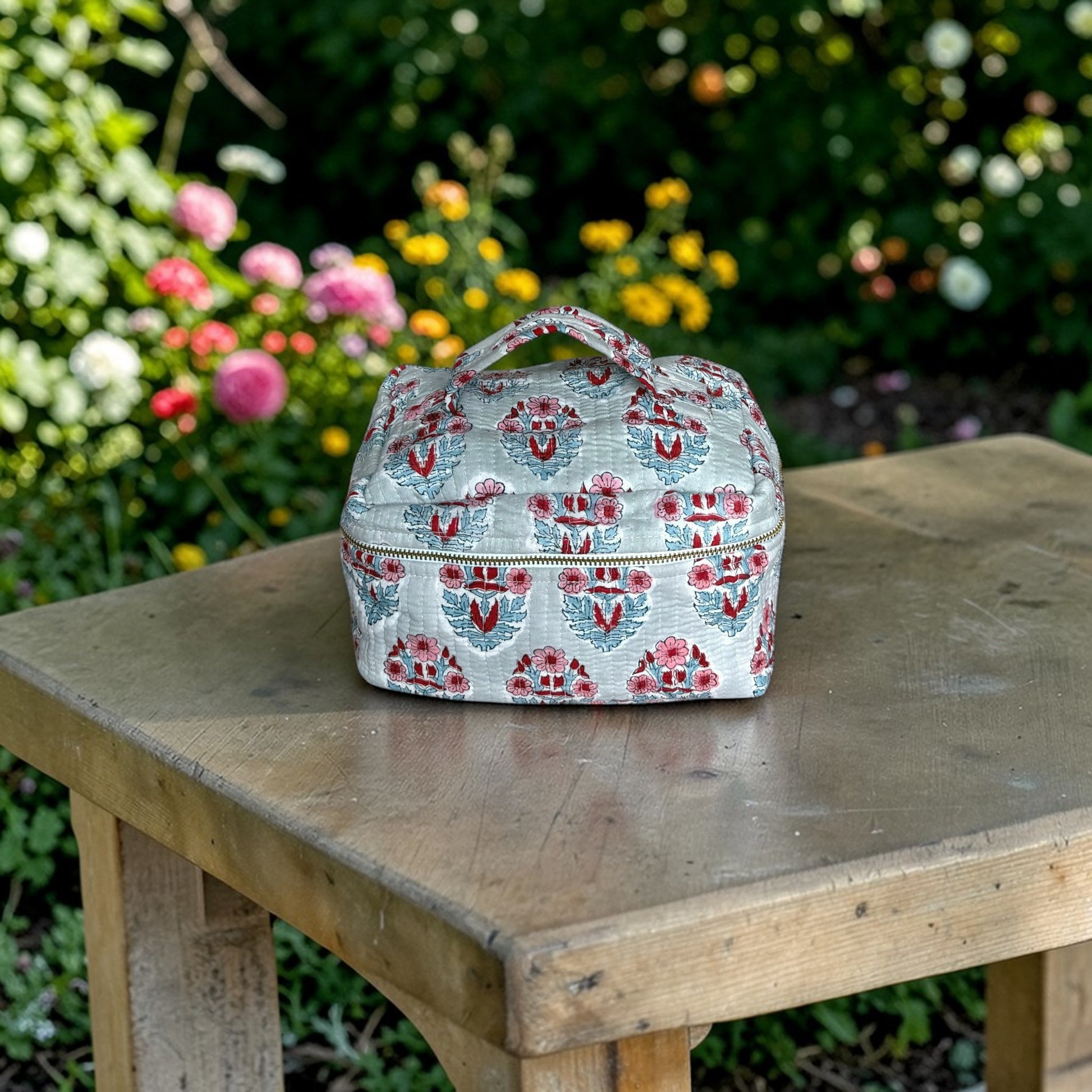 This elegant vanity bag is Made in 100% cotton with authentic block print, enhanced by quilted detailing for added structure and style. The bag opens like a suitcase with a 3-side antique gold YKK metal zipper, providing easy access to all your essentials.